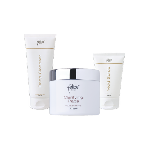 Dé startset die binnen 2 à 3 weken een zichtbare opfrissing van de huid geeft met verfijning van de porien. Dagelijkse dieptereiniging met scrub en clarifying pads om de talgproductie te remmen.